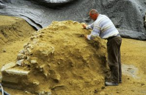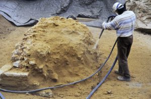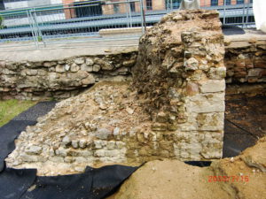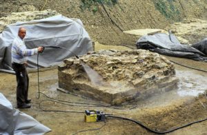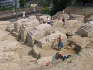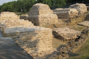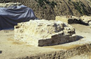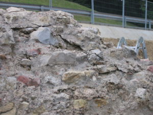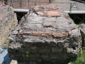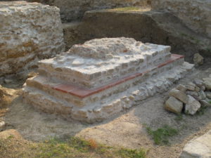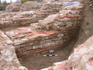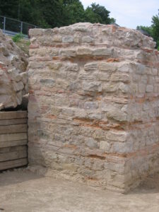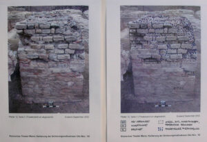 Because of ground and weather conditions, considerable damage had occurred to the substance of the original relics, especially the layers of ceramic bricks are at risk of decomposing because of frost damage. After cleaning off the pillar surfaces, first attempts of conservation had been undertaken in 2002 by spouting of special lime mortar with high pressure onto the damaged surface to create a protecting layer. A more effective result of sustainability and stability was achieved during the second period of conservation works in 2008/9 by traditional manual brickwork done by experienced masons. First, they deeply cleaned the original substance from any biological matter and then applied the appropriate mixture of special lime mortar by hand.