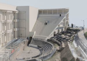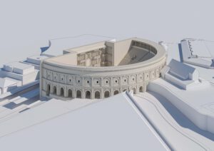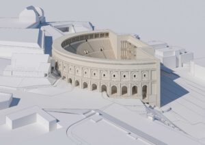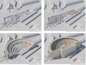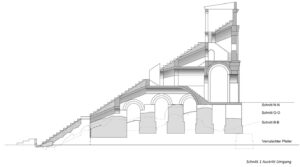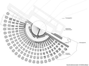 The discussion about the dimensions of the theatre needed a scientific base for the imagination of the Roman Theatres original historic appearance. Fortunately, Stefan Schmitz, a private sponsor of cultural projects in Mainz and Rheinland-Pfalz ordered a scientific research for a serious study on the historic building conditions of the theatre. The results, in form of graphic accounts of a theoretical reconstruction, should extend the state of knowledge of the involved participants of planners and decision makers in policy and administration and of course fuel the imagination of the public discussion. With extensive investigation and verification of the excavation documents and by examination of the original construction conditions of the Roman remaining building elements the most appropriate construction principles could be defined as for the gradient ratio of the Cavea stairs above construction domes, the position of the Praecinctio and the access possibilities from inside and outside. Because detailed architectural design elements for columns or the outside façade could not be verified by the excavation, abstract theoretical reconstruction elements are applied in plausible dimensions.