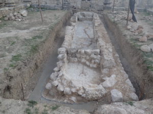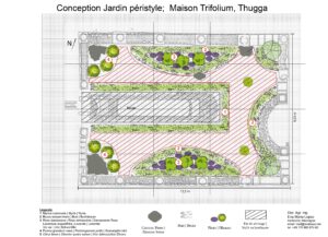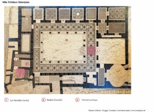 The complex of the Roman Villa Maison du Trifolium is exemplarily suitable to perform as a representative for the standard and qualities of the Roman way of life. The room organization with peristyle around a courtyard with garden and arrangement of water basins and a fountain, the comfortable vaulted guest rooms for dining and meeting and its variety of discovered extraordinarily designed mosaics is a typic example for the high standard of roman living conditions. It should be a great experience for visitors to get presented these qualities by a vivid garden in a historic arrangement with a revitalized water basin and running fountain. The reinstallation of original mosaics in some rooms and the corridor ground shows how opulent interior endowment had been in use. Some detailed information panels generate an easily interpretable graphic image of historic Roman life.