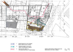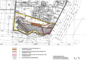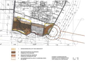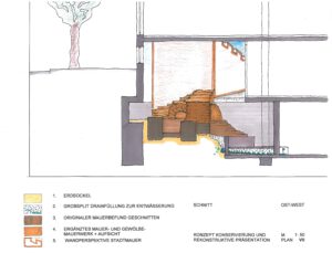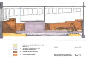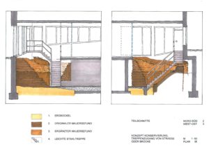 During the foundation work for a big 6-story residential building near the Roman Amphitheater in Trier relics of the Roman City Wall came to light. The question was how to react, either to demolish the ancient findings for the construction, or to preserve the ruins for presentation inside the new building. The Roman relics show parts of the former city wall, integrating a round tower and crossed by a Roman aqueduct called Ruwer Channel. Therefore, the relics present interesting components of the ancient city. The concept includes the restored and partly reconstructed relics of the City Wall and its tower as well as it shows how the channel crosses the wall in the basement floor of the modern building. The open space above the relics is traversed by a small gallery. A narrow staircase for visitors leads down to see the details of the archaeological components. Another access to the basement floor leads on the same level from the newly built parking garage to the exhibition. To allow an understanding of the historic situation, a large image of the Roman city wall is painted on the following wall board.