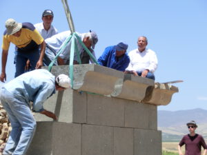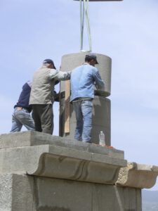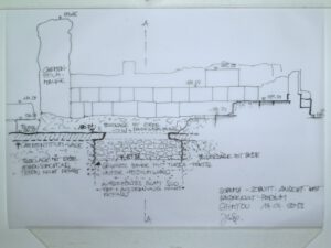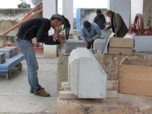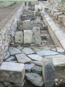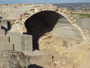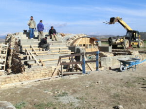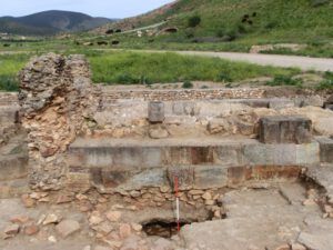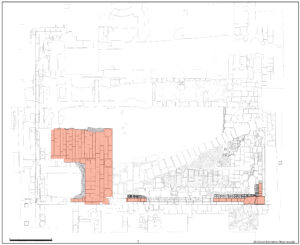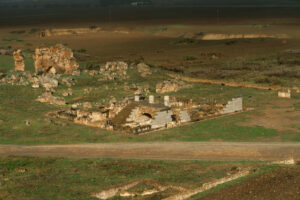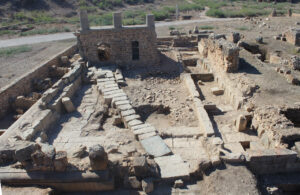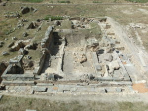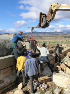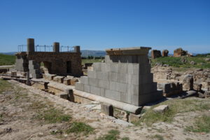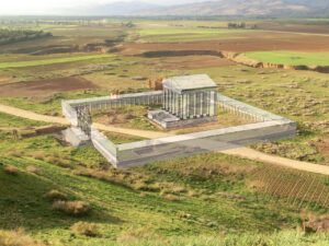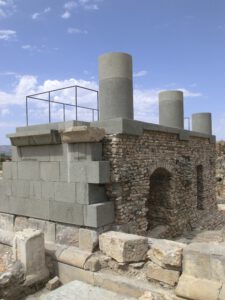 The building history started with a Roman temple surrounded by a porticus. With the Christianization the temple was destroyed and different buildings like a big basilica, and a baptistery, were erected. Massive changes occurred in the Byzantine period and after the Islamic conquest vast destruction some slight medieval settlement could be verified. The presentation concept, based on didactical principles, aimed at a conservation of the ruined foundation zone of the Roman temple basis and some complementation measures in parts of the pedestal and entry staircase. The outside line of the Porticus is marked by a waist-high dry masonry wall. The blocks are created by artificial stone of similar color like the original limestones. Some copies of original blocs like corniches or columns were added. The presentation of later historic building structures must wait until new excavation results of these building elements can be documented. On the Podium information panels illustrate the historical situation and chronology of the ancient building structures.
