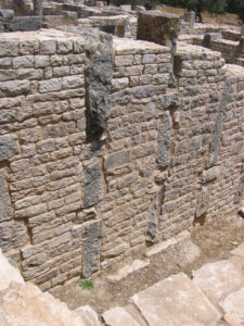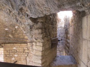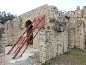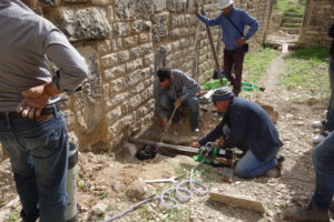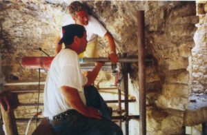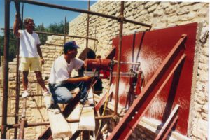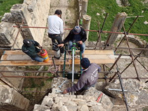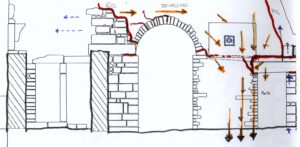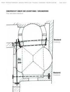 The most dangerous effects on the construction of the historic monument are provoked by the loamy soil, its swelling and shrinking in condition of the quantity of rainfalls and the absorption of water in the ground. Settling of wall foundations causes big damages by cracks and inclination of pillars and vault-constructions. Therefore, a system of strong steel tieback anchors had been installed at the bottom of the vault system to avoid further extension of side track. Slim foundations of heavy stonewalls had been strengthened by continuous concrete reinforcement. Partly walls are demolished and rebuild again. Especially by inclination affected pillars – in which holes and cavities are sprouted because the joints mortar filling is washed out – are stabilized by special mortar intrusion, handled with improvised pump instruments.